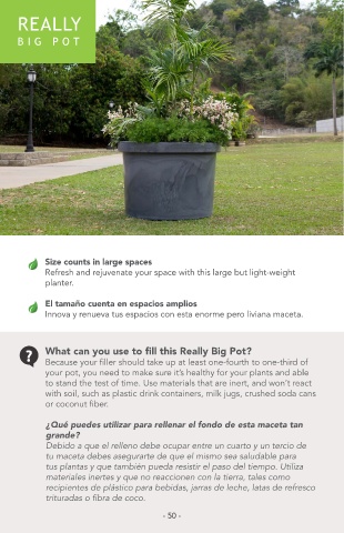 tus plantas y que también pueda resistir el paso del tiempo. Utiliza 46” Really Big Pot 46.12 x 31.87 x 37.5 117.14 x 80.94 x 95.25 40 18.2