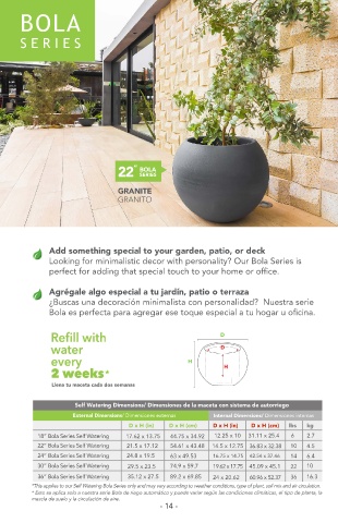 18” Bola Series Self Watering  17.62 x 13.75  44.75 x 34.92  12.25 x 10  31.11 x 25.4  6  2.7  23” Bola Series Non Self Watering  23 x 17.75  58.42 x 45.09  15.5 x 17.75 39.37 x 45.09  10  4.6