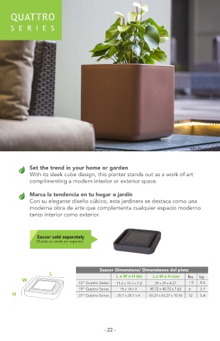 H 27” Quattro Series 25.7 x 25.7 x 4 65.27 x 65.27 x 10.16 12 5.4 19” Quattro Series 19.12 x 19.12 x 19.5 48.5 x 48.5 x 49.5 11.75 x 11.75 x 17 29.84 x 29.84 x 43.18 16.8 7.6